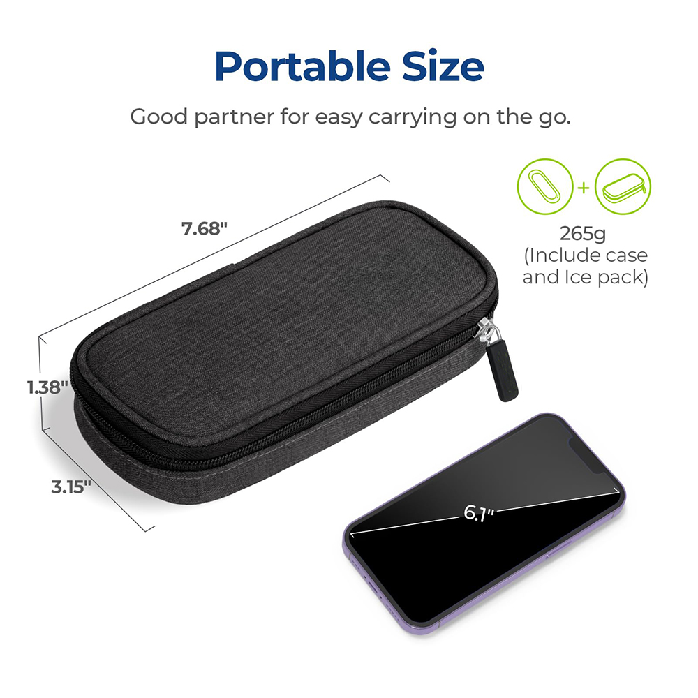 Ideal Size for Daily Life: This insulin travel case is compact 7.7 x 3.15 x 1.38in for easy carry. The small insulated cooler bag designed in the right size can be held with one hand easily and fit your handbag or backpack. This medication cooler is a great choice for commuting to work or school, outdoor camping or short trips